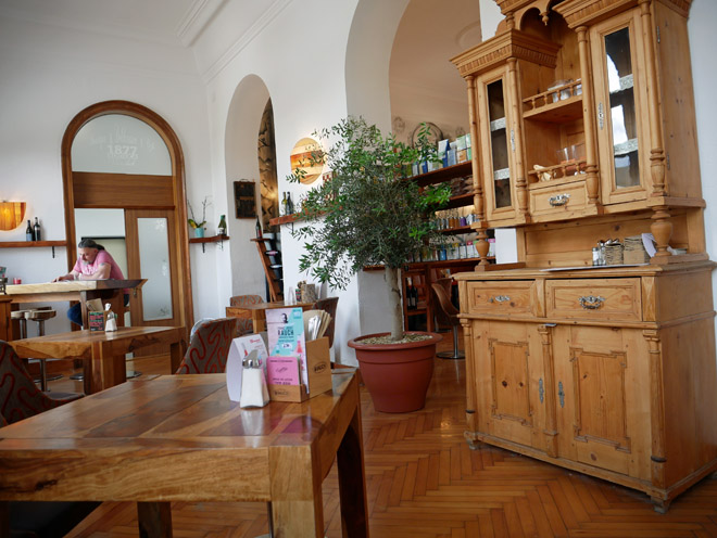 「ランチなら時計塔のレストランかな」と、息子が薦めてくれました。グラーツの町を一望できるシュロースベルク(城山)には山を縦に貫通するエレベーターで上り、そのレストランに直行しました。
