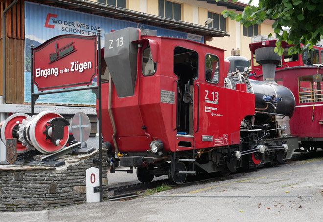 麓の湖岸駅には、急勾配を登るためにタンクが傾いている真っ赤な蒸気機関車が待機していました。