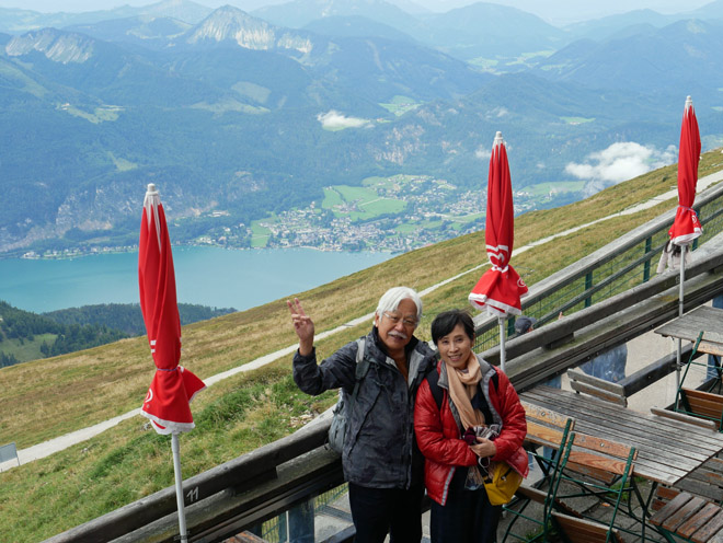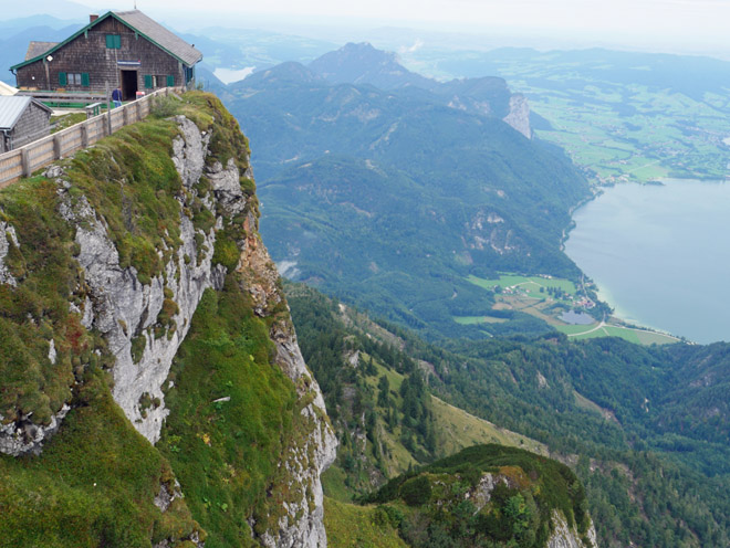 シャーフベルクバーン(登山鉄道)の頂上駅、シャーフベルクシュピツッェまで登ってきました。ヴォルフガング湖を眼下にする雄大な景色が広がっていました。