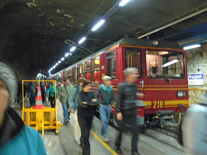 クライネシャイデックから乗り継いだユングフラウ・バーンは、アイガーの山腹をぶち抜いた景色のないトンネルをひたすら登りました。