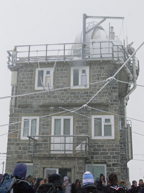 期待に反して生憎の空模様。眼の前にそびえるスフィンクス展望台ですら雪に霞んでいました。