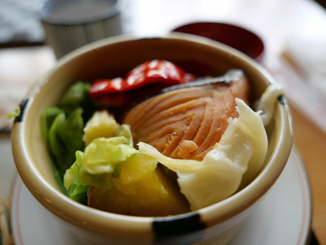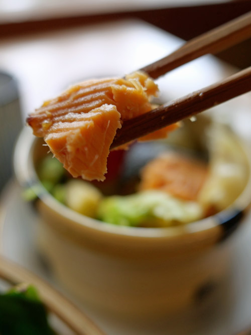 メーンの蒸し物です。鶏団子かのセレクトでしたが、鮭と野菜です。