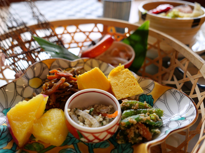 看板メニューの「花美津姫ランチ」(1760円)を頼みました。かごに惣菜がきれいに盛られています。どれも安心して食べられます。