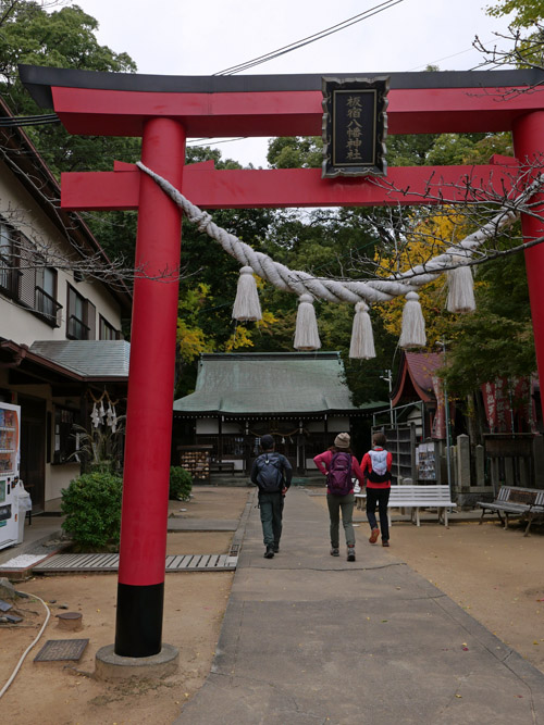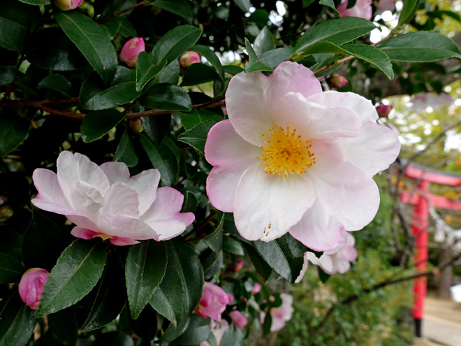 板宿に向けてゆるかかな山道を下りました。板宿八幡神社に淡いピンクのツバキが咲いてました。