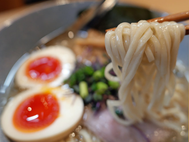 中華蕎麦三藤(みつふじ)大阪島本店の「貝出汁塩中華蕎麦 半熟味玉付き」(1280円)です。完璧な半熟卵も色鮮やかなみごとなビジュアルです。