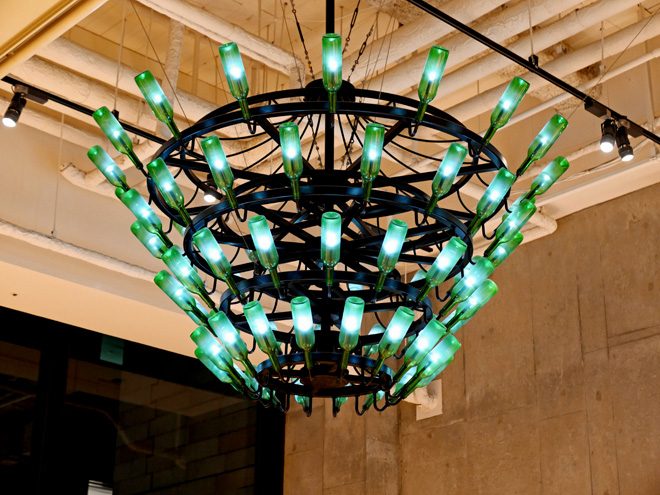 天井のシャンデリアをよく見ると、ワインの空き瓶でした。でもランプをどうして差し込んだのでしょうか。