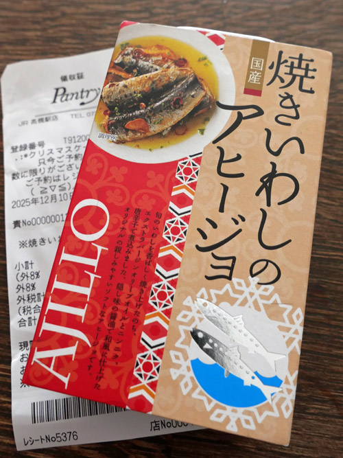 JR高槻駅前のジムからの帰り道。ランチの店を探すのも億劫となり、駅コンコースのパントリーJR高槻駅店に寄りました。パスタの具材となりそうなものを物色。「焼きいわしのアヒージョ」の缶詰にしました。