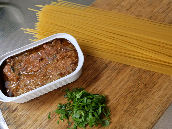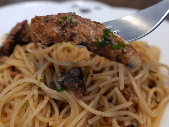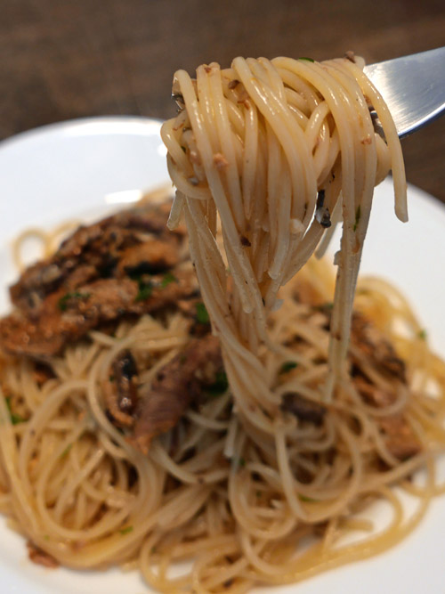 後は簡単。パスタを茹で、別のフライパンでオリーブオイルと缶詰の残りのオイルをニンニクと温めただけです。パスタを茹でる塩以外には、調味料のたぐいは使っていません。