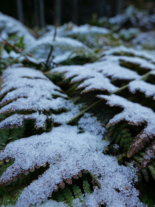 シダの上に雪が氷となって降り積もっていました。