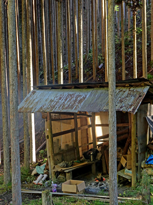 だれもいない小屋から焚き火の煙が上がっていました。山仕事をされているのでしょう。
