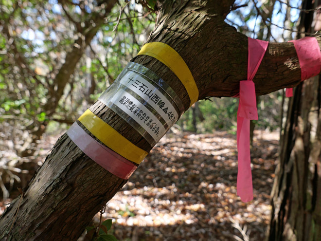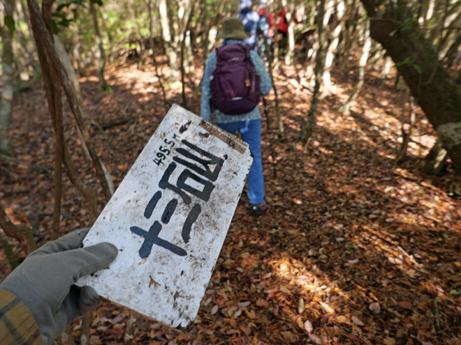 十三石山の頂上直下を歩いていると、なんと山頂標識が転がっていました。風に吹き飛ばされて来たのでしょうか。拾って元のピークに戻しました。