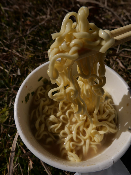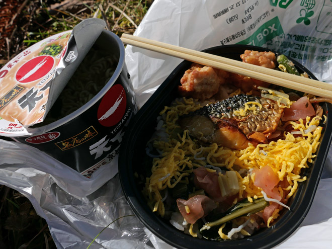 わたしの昼飯は、途中のコンビニで買ってきた弁当とミニ・カップラーメンです。