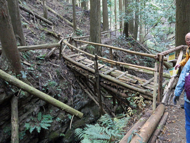 3年前には渡ることができた丸太橋は、通行不能となってました。橋脚が腐って、崩れ落ちそうです。
