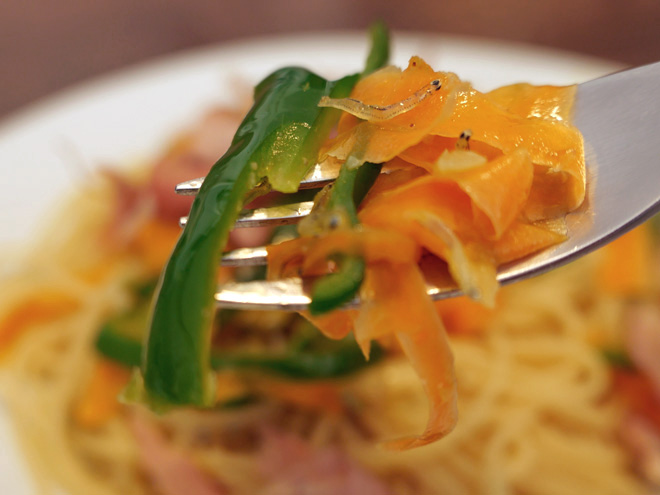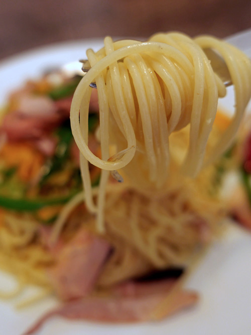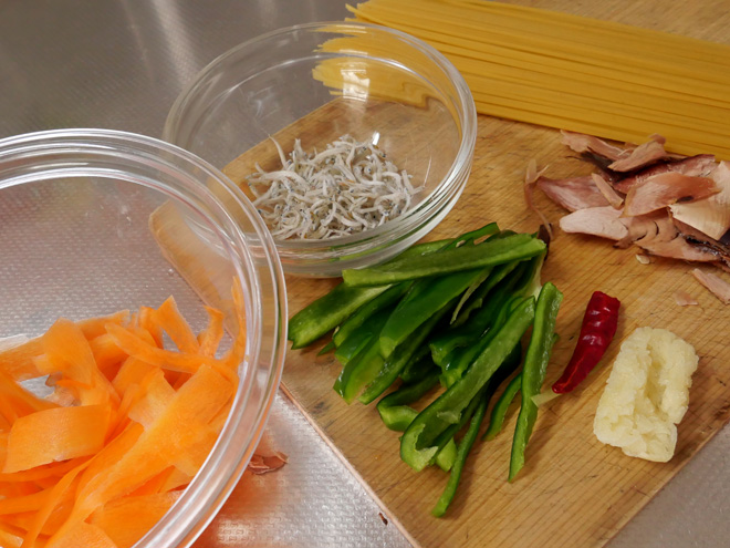 自分でつくる ピーマンとニンジンのペペロンチーノ かかりつけの近所の内科医が、これまでになく混雑していました。帰ってきたら、もう昼でした。飽きもせずにパスタです。 冷蔵庫に1つ、残っていたピーマンと、ピーラーで薄く切ったニンジンをペペロンチーノ・オイルで炒めました。ちりめんじゃこも加えましが、調味料は塩、コショウだけ。分厚い鰹節もトッピングしたので、あっさりとしながらも味わい深い仕上がりとなりました。 シャキッとしたピーマンが好きです。青椒肉絲も食べたくなりました。 1本のタカノツメもよく効いて、タバスコなんて不要です。