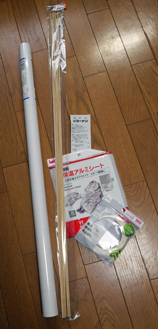 近所のホームセンターで材料を買ってきました。竹ひご以外は併設の百均です。
