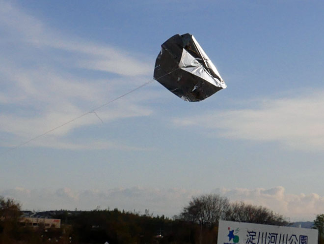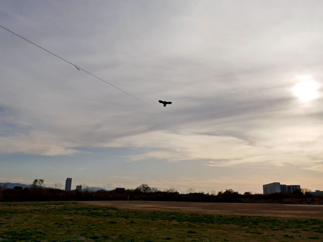 さっそく淀川の河川敷公園に行って、テストフライトをしました。風は弱かったですが、軽々と舞い上がってくれました。