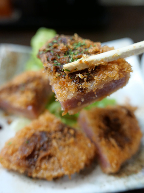 揚げたての「厚切りハムカツ」がビールにあいます。