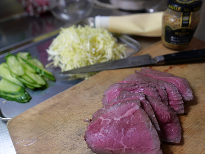 年末につく作ったローストビーフの残りをパンではさみました。レタスがなかったので、線切りのキャベツです。目玉焼きも添えておいしくいただきました。