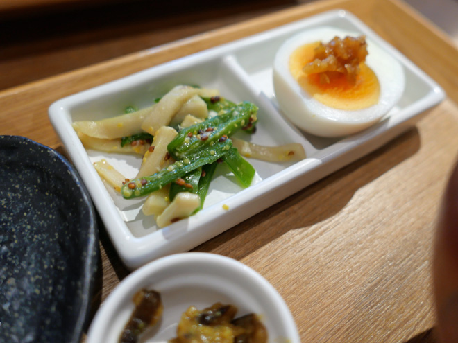 柚子味噌が載った玉子やピーマンときのこが付け合せです。