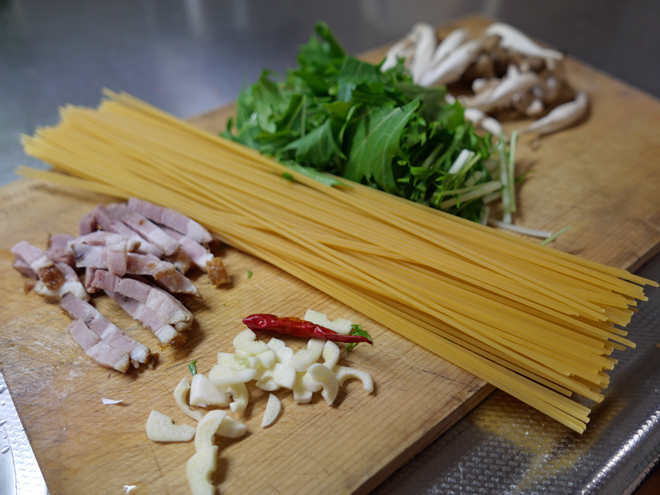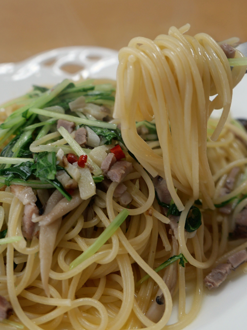 自分でつくる 水菜とベーコンのペペロンチーノ 久しぶりの自分でつくるパスタです。今年初めてです。 水菜とベーコンのペペロンチーノです。代わり映えのしないビジュアルですが、安定のお味です。 厚切りのベーコンが、良い出汁になってました。 テレビを見ていたら、神戸・グリル一平のイタリアンが紹介されていました。鉄板の上に生卵をグチュグチュ。ああ、そちらも食べたい!!