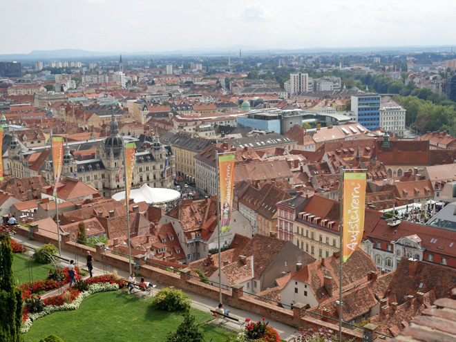 オーストラ第2の都市、グラーツです。世界遺産の旧市街を見下ろす山にある時計塔のレストランです。