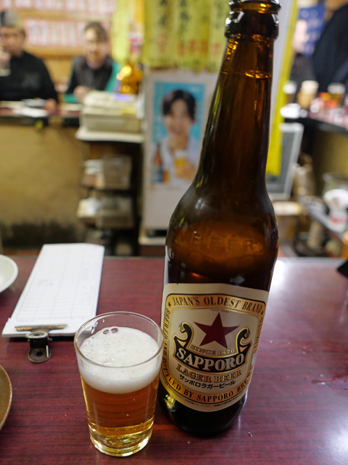 ここでは生中よりも瓶が主流です。銘柄を聞いてくれます。わたしは赤星(サッポロ・ラガー)です。