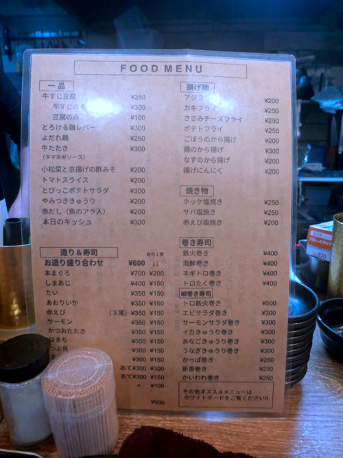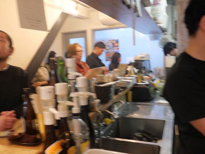 京都の町は小雪もちらついて冷え込んでました。新町錦の近くの路地にある「立ち飲み やみー」に入ると、一瞬でメガネが真っ白に曇り、何も見えなくなりました。カメラもフィルターが真っ白で、しばし使い物になりませんでした。