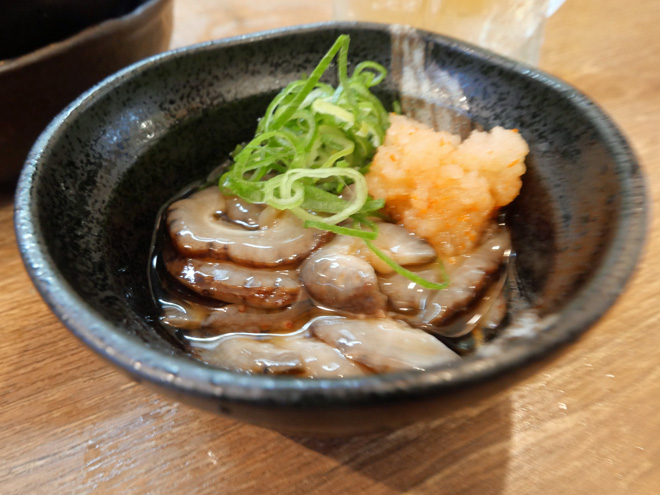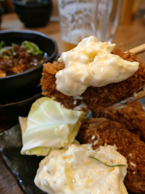 揚がったばかりのカキフライに、タルタルソースをたっぷりと盛っていただきました。パリッとしたごぼうのから揚げもうまかったです。