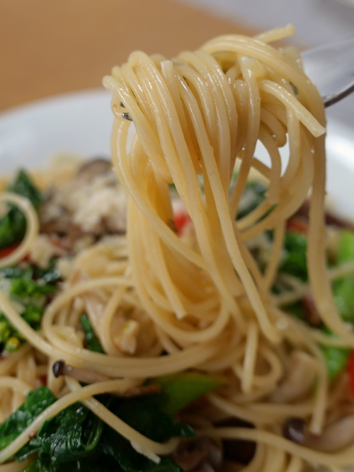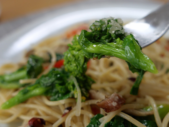 自分でつくる 菜の花のペペロンチーノ もうすぐ春~ですね。菜の花のシーズンとなりました。パスタにしました。 ペペロンチーノ・オイルで軽く炒めるだけで、菜の花のシャッキリ感を残しました。 菜の花のちょっとしたほろ苦さがおいしいです。 赤ワインのソーダ割りが、脂ぎった口に爽やかです。 彩りに真っ赤なパプリカとシメジを追加しました。最後にパルミジャーノ・レッジャーノを振っています。