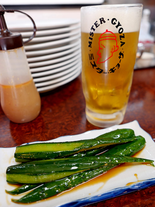 餃子(6個)2人前ときゅうりの丸漬け、生ビールがお決まりです。