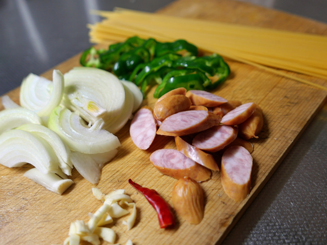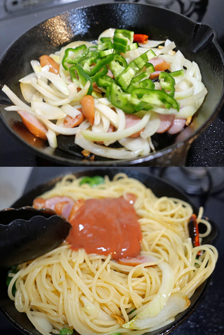 スキレットでウインナーソーセージとタマネギ、ピーマンを炒めます。茹でたスパゲッティにケチャップなどで味付けしたソースを和えれば完成です。