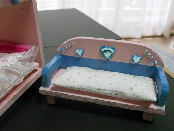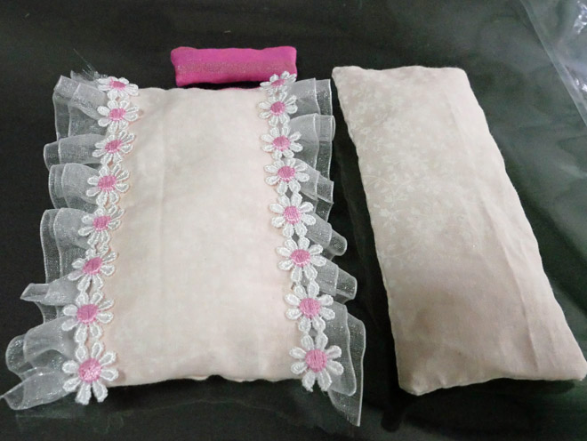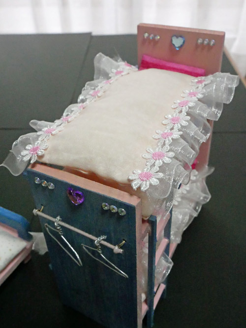 ミキちゃん・マキちゃん、暖かにお休みなさい ばーばが今度はがんばりました。 リカちゃんの双子の妹「ミキちゃん」と「マキちゃん」が眠る2段ベッドの布団ができあがりました。 4歳になった末孫娘の注文に、ばーばは百均で端切れを買ってきて、針仕事でした。 布団と枕の3点セットが2組です。フリフリがかわいいです。 ソファーにもクッションを置きました。 孫娘は連休にやってきます。どんな表情で遊んでくれるのか、楽しみです。