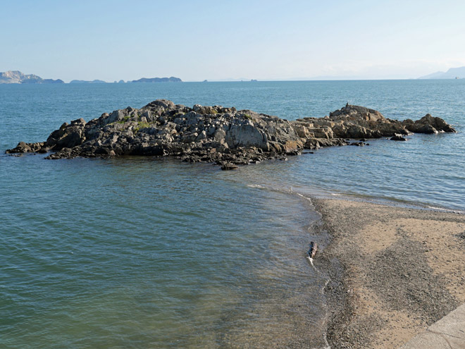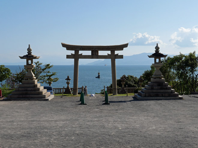 早く着いたので、赤穂御崎まで行ってみました。瀬戸内海に向かって伊和都比売(いわつひめ)神社の鳥居が立っていました。向こうは小豆島です。
