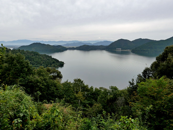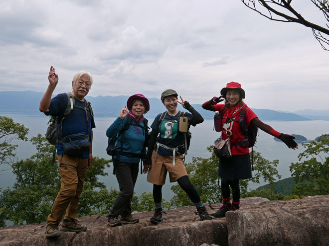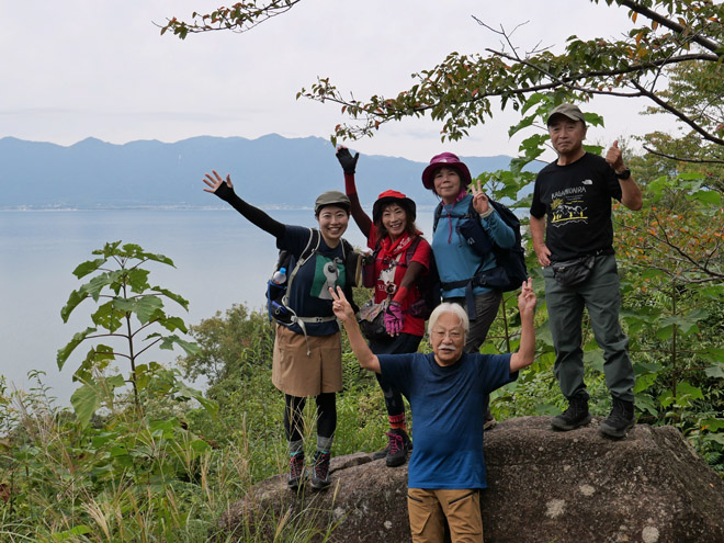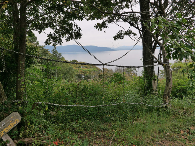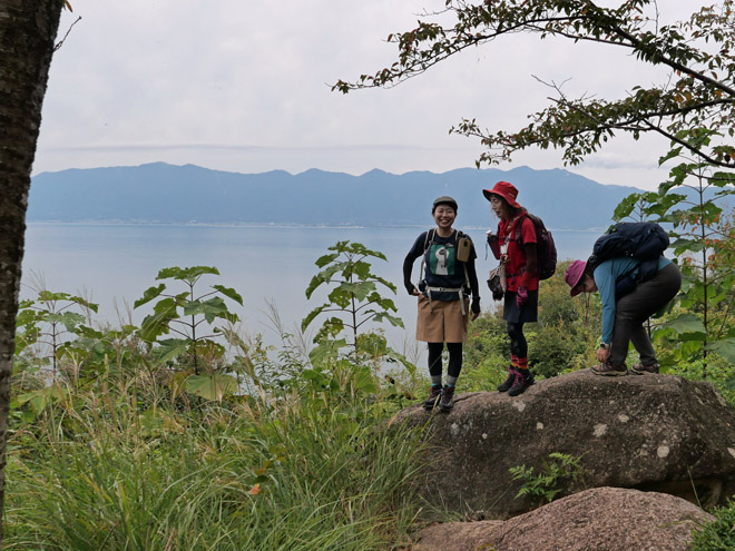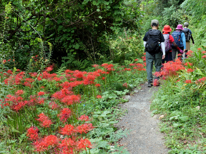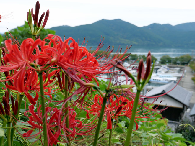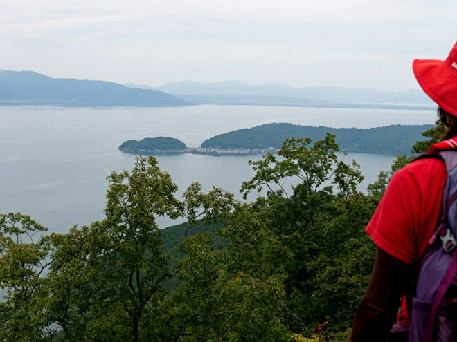 島の中央にあるケンケン山などを周回しました。標高は200m、東西は3キロほどというミニ縦走です。びわ湖を見下ろし、ヒガンバナが咲き乱れる湖畔の道を歩きました。