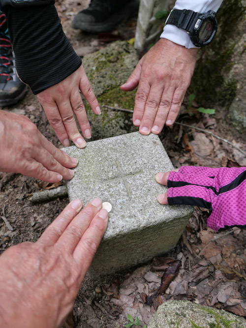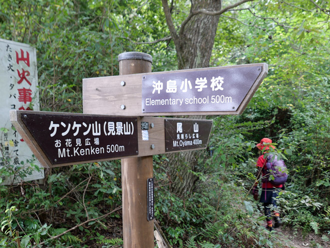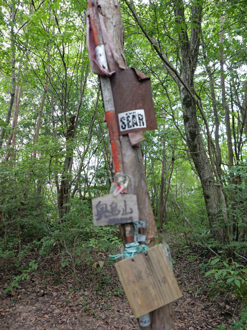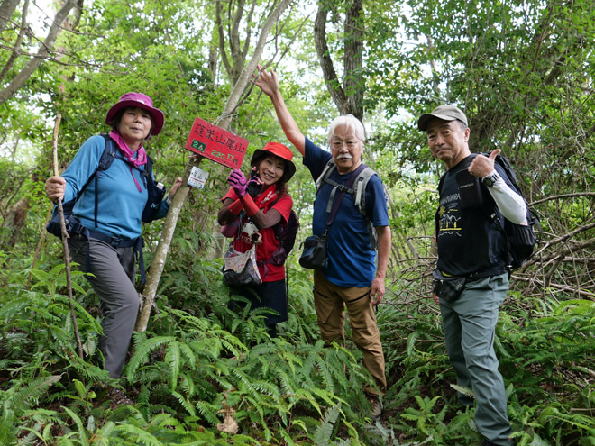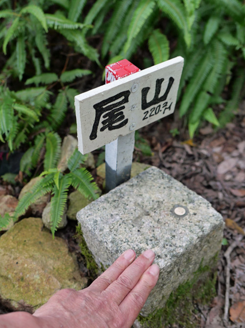5分ほど戻ってルートからちょっと外れたポイントが、真っ赤プレートを掲げた尾山でした。