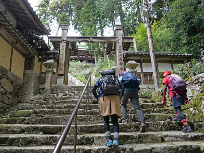 車で10分ほどの長命寺にやってきました。中腹の駐車場に車を止めて歩き始めました。それでもああしんど!