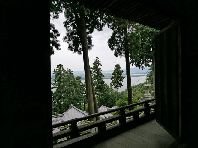 本堂でお参りして振り返るとびわ湖がのぞけます。