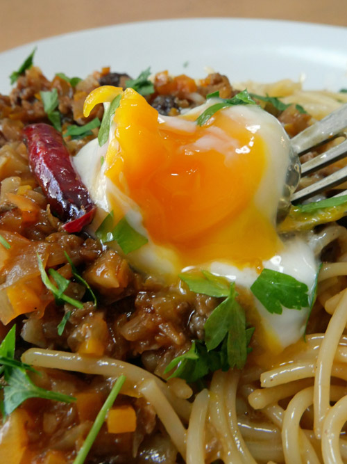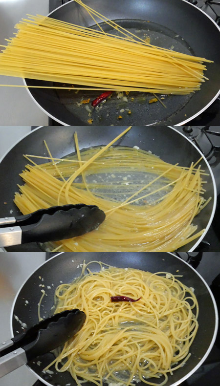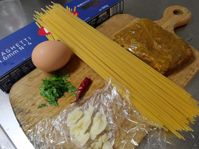 ワンパンでアーリオ・オーリオ・ペペロンチーノをつくり、白ワインを注いで温めたドライカレーをかけただけです。