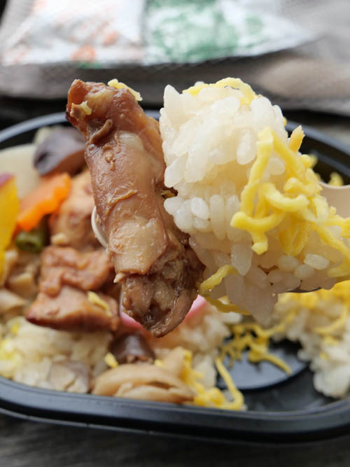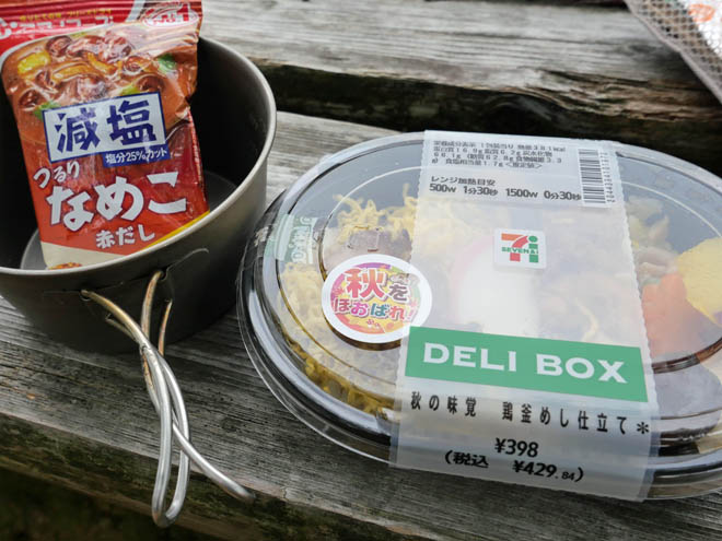 ちょっと早いですが昼飯にしました。途中のコンビニで買ってきた「秋の味覚 鶏釜めし仕立て」です。湯を注ぐだけのみそ汁もつくりました。