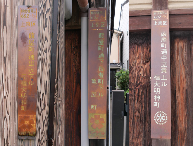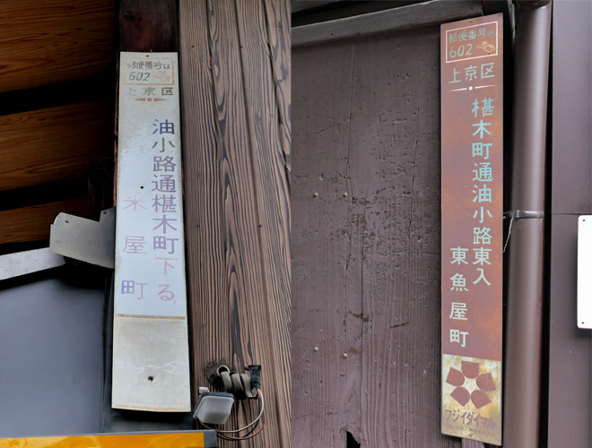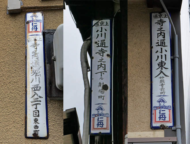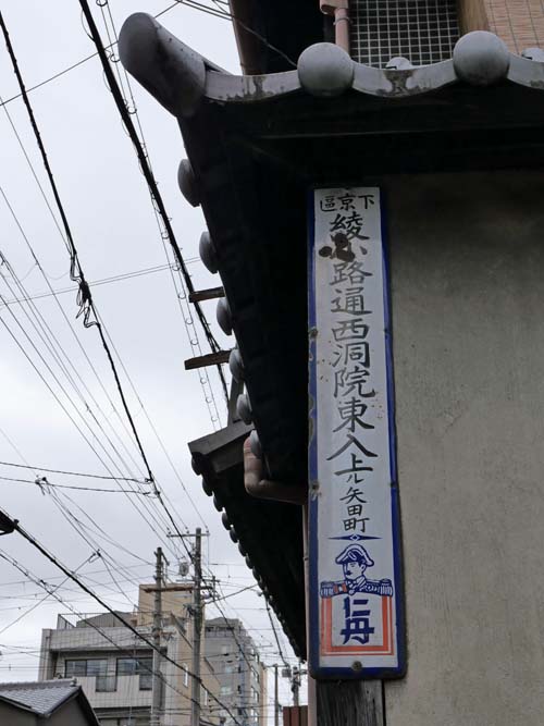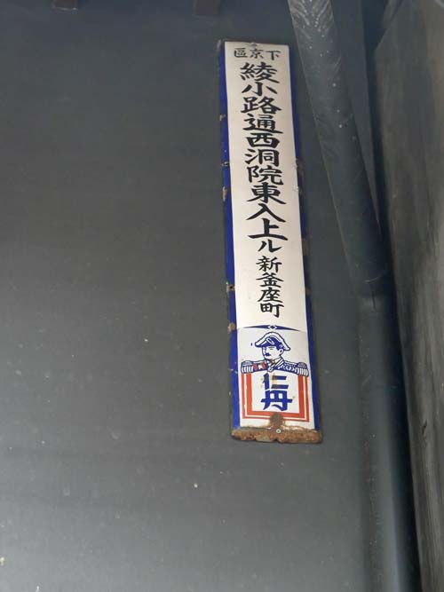 仁丹町名看板とか仁丹町名表示板とも呼びます。京都人なら、あれあれと、ご存知と思います。大阪に本社を置く「森下仁丹株式会社」が広告のために町の辻々に掲げた町名表示板のことです。今も500枚以上が残っているそうです。