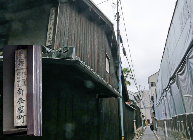 後戻りすると、江戸時代に創業した呉服商で重要文化財になっている杉本家住宅の土蔵らしき壁の上部に「新釜座町」の仁丹看板を見つけました。