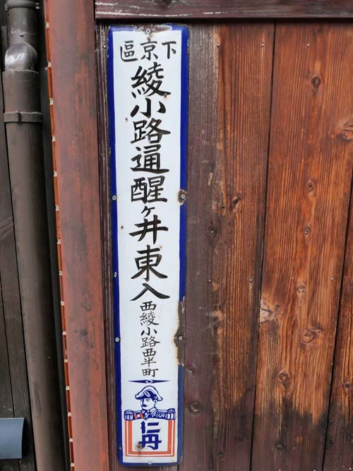何度も見過ごした末に見つけました。「綾小路新町西へ上新釜座町」の木製仁丹看板です。