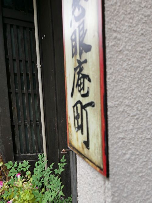 2枚目は、古い商家の柱と同化しているような「東魚屋町」です。上部に仁丹と書かれているのが読み取れます。
