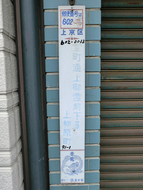 ありました。四条烏丸近くの膏薬辻子(図子、こうやくずし)にある商家の上に「新釜座町」とかかっていました。小雨が降っていたので、レンズが水滴をかぶっていたのでしょう。画像が乱れています。