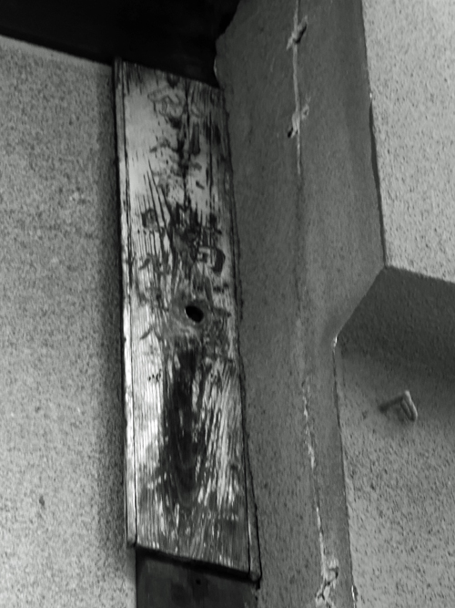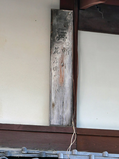 そして見つけました。木製看板を。左上のエアコン室外機の上の柱です。