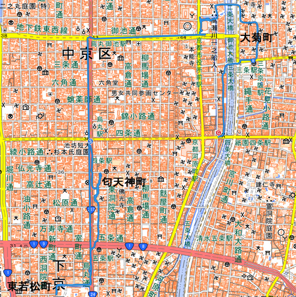 歩いた軌跡です。地下鉄五条ー京都市役所間もつながっています。