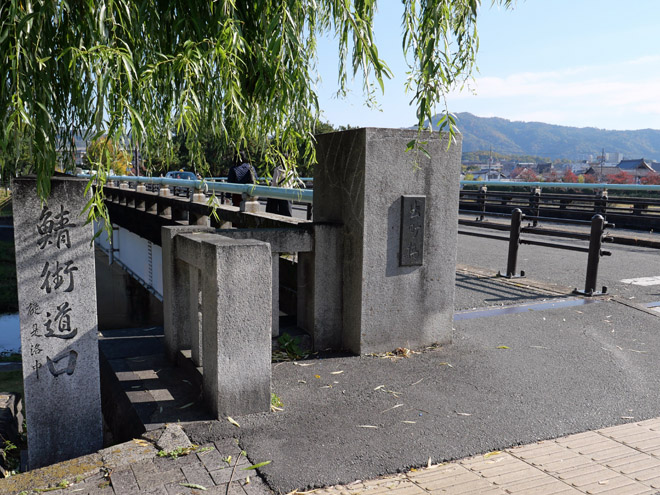 出町橋の横に鯖街道口の石碑があります。鯖街道は若狭の小浜から山道を越えてここまでつながっています。
