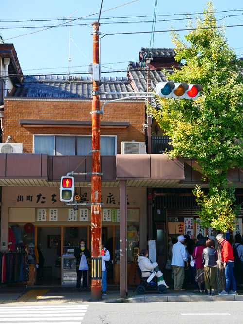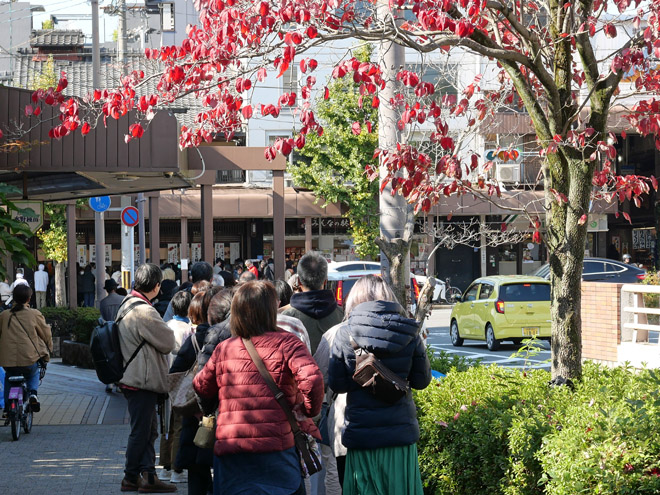 きょうも長い行列ができています。河原町をはさんだ向こうにある豆餅で人気の出町ふたばの待ち客です。整理していた店員に聞くと「70から80分の待ちです」ということでした。