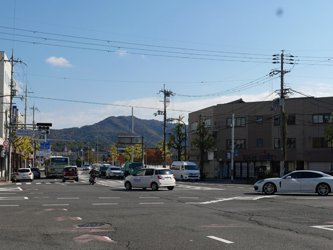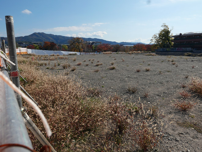 交差点の南東角のパチンコ店などががなくなってスカスカになってました。フェンスの向こうは、広大な更地が出現していました。正面は大文字山です。