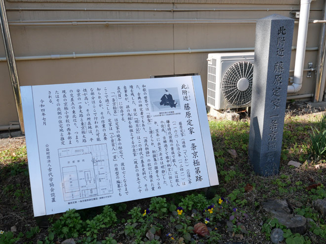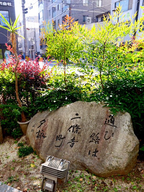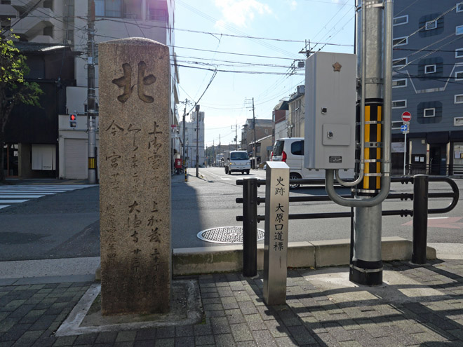 寺町今出川の交差点です。大原口の道標がたってます。豊臣の時代に京の都を取り囲んだ御土居(おどい)に開かれた京七口のひとつです。